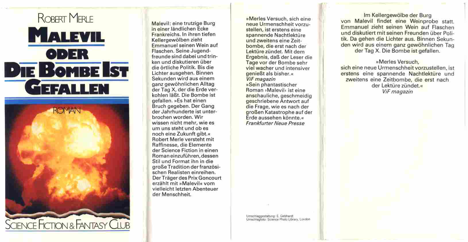 | | Donnerstag, den 19. 04. 2001 - 19:42 Merle, Robert: Malevil oder Die Bombe ist gefallen, Ein phantastischer Roman, Aus dem Französischen von Eduard Zak, Gütersloh, Bertelsmann o.J., 511 S., OLwd. - <Bestellnr. 11302A> DEM 15,00 [SW: Literatur] Gefunden im Katalog Varia (13592 weitere Einträge) Anbieter: Antiquariat Wolfgang Rüger [D-60594 Frankfurt/Main] Standardtip: Zentralversand antiquarischer Bücher. Zur Zeit ist das eine Exemplar greifbar. Die Bestandlisten werden täglich aktualisiert.